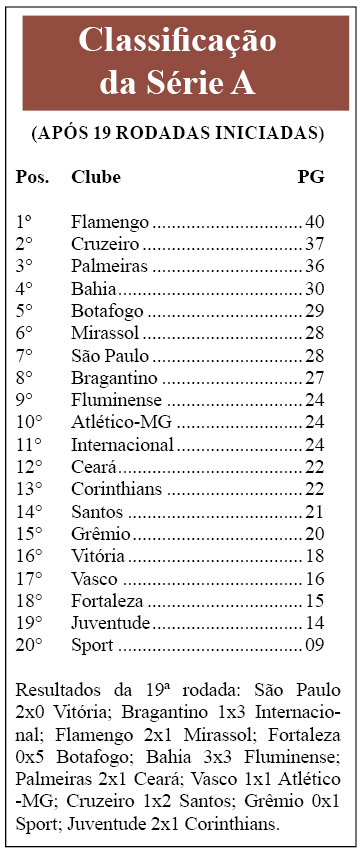 Depois do Mengão, o segundo com mais probabilidades de dar a volta olímpica é o Palmeiras, embora atualmente figure em 3º na tábua de classificação, atrás do Cruzeiro (MG). É que computada a vitória de virada que impôs em casa ao Ceará (CE), o alviverde passou a contar com 29,5% de probabilidades de beijar o caneco, ante 12% da Raposa. O cacife cruzeirense caiu depois de o time alvianil, que abrira o marcador, sofrer nova derrota em Belo Horizonte, desta vez para o Santos.