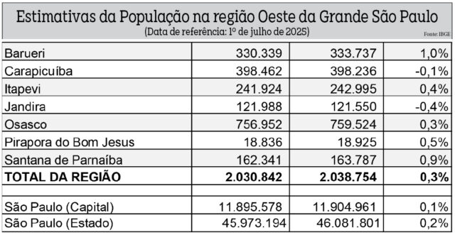 Em termos proporcionais, a cidade que mais cresceu foi Barueri, com taxa de 1,0%, subindo de uma população com 330.339 habitantes em 2024 para 333.737 em 2025. Já os municípios de Carapicuíba e Jandira tiveram diminuição em suas estimativas, em -0,1% e -0,4% respectivamente.