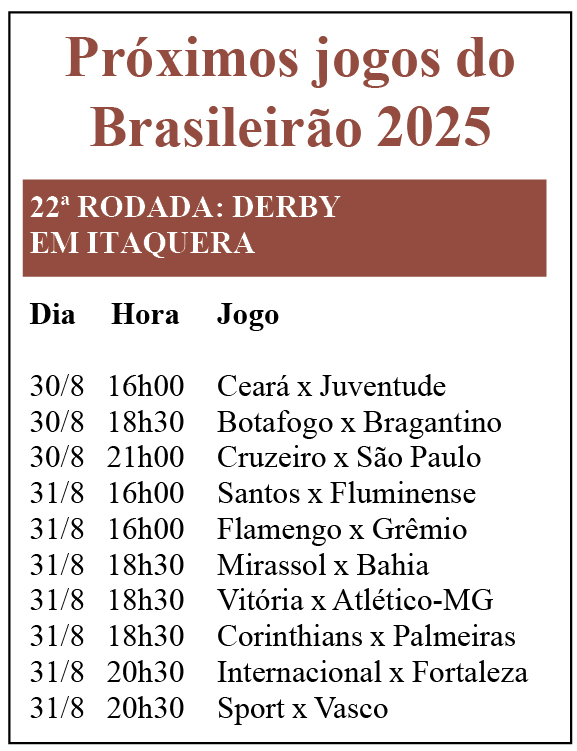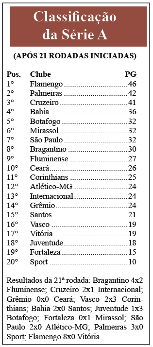 Ao término da 21ª rodada do Campeonato Brasileiro de futebol na noite de segunda-feira, 25 de agosto, os dois líderes entraram em campo e se aproveitaram sem esforços da fragilidade de ambos os adversários, ocupantes da área de degola. Ainda com um jogo em aberto na competição, o Flamengo (RJ) manteve a distância de 4 pontos em relação ao Palmeiras aplicando a mais retumbante goleada deste Brasileirão 2025: a vítima foi o Vitória (BA), que no Maracanã caiu por 8×0. Com um pouco menos de gana, também como anfitrião, o alviverde derrotou outro rubro-negro, o Sport (PE), por 3×0. Neste final de semana, a equipe carioca será visitada pelo Grêmio (RS), enquanto o Verdão irá ao terreiro do arquirrival Corinthians para mais um Derby (ver quadros).