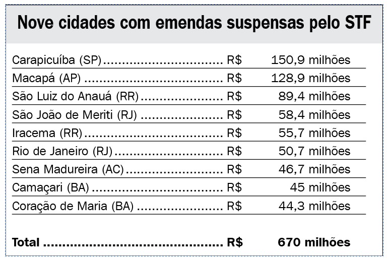 Presente em quase todas as listas de recebimento de “emendas-Pix”, o município de Carapicuíba também não ficou de fora dessa última listagem do ministro Flávio Dino, e lidera o rol dos dez municípios que mais receberam recursos, com um total de R$ 150,9 milhões em verbas. Os outros nove são: Macapá (AP), São Luiz do Anauá (RR), São João de Meriti (RJ), Iracema (RR), São Paulo (SP), Rio de Janeiro (RJ), Sena Madureira (AC), Camaçari (BA) e Coração de Maria (BA). No total, os nove municípios da lista de suspensão somam um montante de R$ 670 milhões (ver quadro).