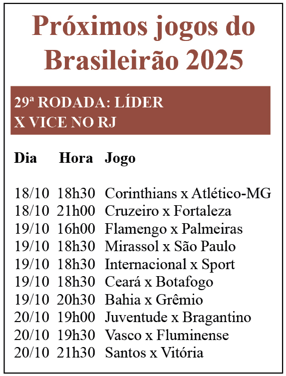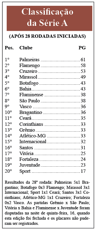 Após o recesso para o cumprimento das datas Fifa (ver matéria nesta página) a bola voltou a rolar pelo Campeonato Brasileiro de futebol da Série A com jogos que movimentaram a 28ª das 38 rodadas previstas nesta temporada. Em um desses jogos, o Palmeiras, de virada, goleou o visitante Bragantino por 5×1 na quarta-feira, 15 de outubro, e se manteve líder. Simultaneamente, o Flamengo visitou o Botafogo, ganhou o clássico carioca por 3×0 e conservou a 2ª colocação, com 3 pontos a menos que o Verdão e agora ambos com o mesmo número de partidas. A partir das 16 horas do domingo, 19, os dois ficarão frente a frente no Maracanã (RJ), pela 29ª rodada. O rubro-negro triunfou por 2×0 no turno inicial, em maio. Neste reencontro, caso volte a se impor, alcançará os esmeraldinos na tabela, mas o clube paulista ainda seguirá na ponta pelo número de vitórias, atualmente em 19×17 para a equipe do Parque Antártica (ver quadros).