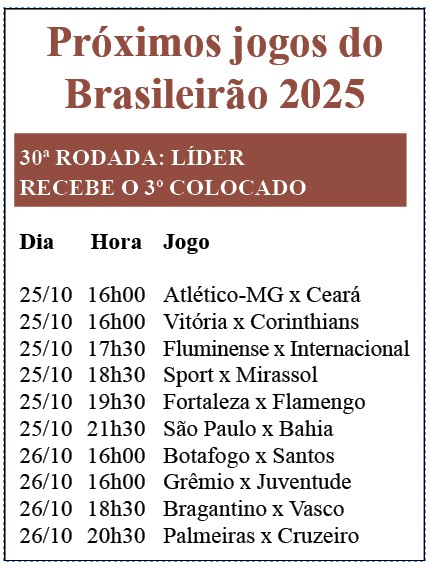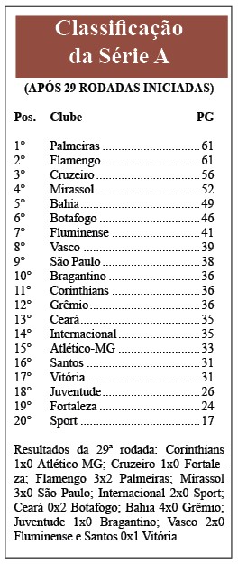 O Campeonato Brasileiro de futebol da Série A terá Palmeiras x Cruzeiro (MG) entre os dez embates válidos pela 30ª rodada, clássico programado para começar a partir das 20h30 deste domingo, 26 de outubro, na Arena Palestra (ver quadros). Atual líder, o Verdão receberá o 3º colocado e tentará se reabilitar da derrota por 3×2 sofrida no domingo, 19, quando visitou o Flamengo (RJ). Esse triunfo dos cariocas permitiu aos rubro-negros se igualarem ao alviverde em número de pontos, 61 (agora ambos também somam o mesmo número de jogos); mas com uma vitória a menos (19×18) o Fla ainda figura em 2º.