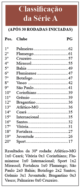 O Palmeiras empatou com o Cruzeiro (MG) em um dos jogos da 30ª rodada do Campeonato Brasileiro de futebol da Série A no domingo, 26 de outubro, e com a derrota do Flamengo (RJ) para o Fortaleza (0x1) voltou a liderar sozinho a temporada, agora com 1 ponto a mais que o rubro negro carioca (2º) e 5 a mais que a Raposa (3ª). Os dois primeiros chegaram a se igualar na rodada anterior (com vantagem nos critérios de desempate para os esmeraldinos) e têm um jogo a menos que os cruzeirenses. O Brasileirão 2025 seguirá neste final de semana e no meio da próxima, ocasiões em que o alviverde tentará preservar a ponta ao visitar o Juventude (RS), penúltimo colocado na tábua de classificação, em 19º; depois receberá o Santos para o “Clássico da Saudade” (ver quadros).