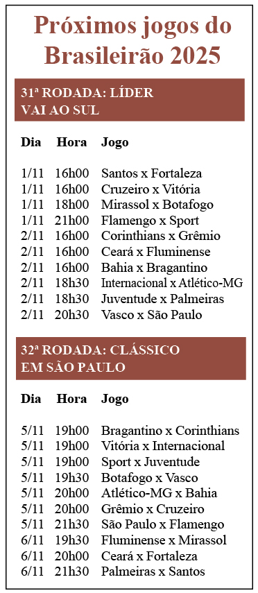 O São Paulo tem patinado no certame. Vinha de três derrotas consecutivas, por isso foi recebido pelos torcedores com descrédito em pleno Morumbi para o duelo tricolor ante o Bahia. Mas contrariou a desconfiança, bateu o Esquadrão de Aço por 2×0 e manteve acesa a esperança de voltar a disputar em 2026 a Copa Libertadores. O resultado ainda deixou o “Mais Querido” à frente do Corinthians, em 9º, com dois pontos a mais que o alvinegro. Na véspera, em Salvador, o Timão vencera o Vitória, por 1×0, alojando-se na 10ª casa do tabuleiro. Agora, o time treinado por Hernán Crespo enfrentará os cariocas Vasco, em São Januário, reduto cruzmaltino, e, depois, o Flamengo. Os onzes mosqueteiros recepcionarão o Grêmio (RS) na Arena Itaquera antes de visitar o Bragantino.