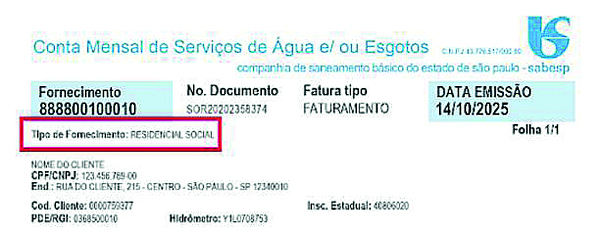 Os clientes da Sabesp podem conferir na conta de água se fazem parte do programa de tarifa social: na parte superior esquerda da conta, onde consta o “tipo de Fornecimento”, deverá estar definido que a conta é “Residencial Social” (ver foto).