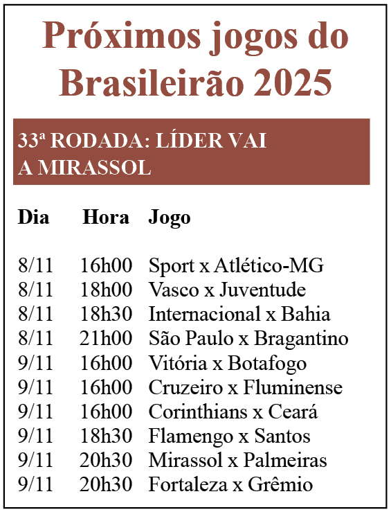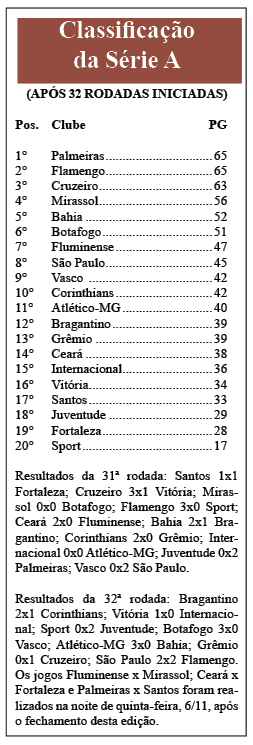 A tabela mostrava – até o início de quinta-feira, 6/11 – o Verdão à frente, com a mesma pontuação do rubro negro carioca, mas com saldo maior de vitórias (20×19), campanha que ainda não computava o resultado do embate disputado contra o Santos, quando esta edição foi fechada e o placar não pôde ser registrado. No domingo, 9 de novembro, o alviverde irá a Mirassol, enquanto o Mengão receberá justamente o “Peixe”. A Raposa pega o Fluminense (RJ).