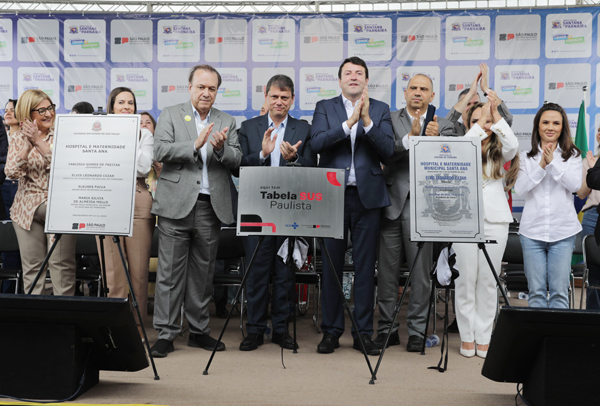O governador Tarcísio de Freitas (ao centro), esteve rodeado de autoridades e anunciou a Tabela SUS Paulista para o novo equipamento - Foto: Secom/PMSP