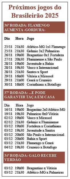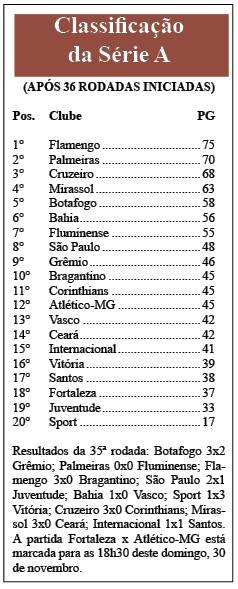 A equipe carioca já soma nesta reta final 5 pontos a mais que o vice-líder, o Palmeiras, com apenas 6 pontos ainda em aberto. O alviverde viu aumentar a “gordura” do rival ao perder de virada por 3×2 para o Grêmio, em Porto Alegre (RS), no mesmo dia do clássico travado no Mineirão. Com o treinador Abel Ferreira considerando que o certame estaria definido já mesmo antes de a bola rolar no estádio gremista, o Verdão também estará em campo no meio da semana que vem, entretanto para cumprir jogo atrasado da 34ª rodada: visitará justamente o Atlético Mineiro, a partir das 21h30 da quarta-feira, 3 de dezembro (ver quadros).