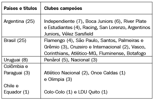 Fora Brasil e Argentina (25) e Uruguai (8) sentiram o gosto de beijar o troféu da Copa Libertadores da América a Colômbia (Atlético Nacional, bicampeão, e Once Caldas); Paraguai (todas as três vezes com o Olimpia); o Chile e o Equador, respectivamente com Colo-Colo e Liga Deportiva Universitária de Quito, uma vez cada.