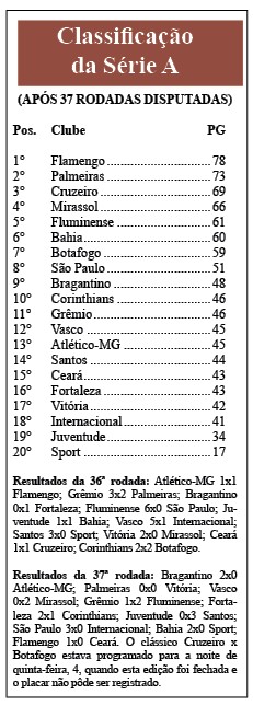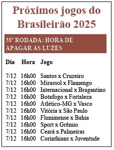 Com a conquista pelo Flamengo (RJ) do título na quarta-feira, 3 de dezembro, todos os jogos da 38ª e última rodada do Campeonato Brasileiro da Série A serão disputados neste domingo, 7, a partir das 16 horas. Vencedor do Brasileirão 2025 ao superar o Ceará (CE) no estádio do Maracanã por 1×0, o rubro negro coroou uma temporada que inclui o tetra da América do Sul e de malas prontas para o Catar, onde buscará o troféu da Copa Intercontinental (ver matérias nesta página); passará, antes, por Mirassol, onde enfrentará a mais grata surpresa do torneio nacional. Em sua primeira passagem pela divisão de elite do país, o “Leão Caipira” está entre os clubes classificados já para a fase de grupos da Copa Libertadores da América, feito que alcançou ao ganhar por 2×0 do Vasco (RJ), em pleno estádio de São Januário (ver quadros).