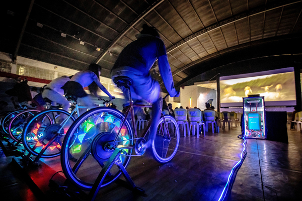 No BikeCine, o público pode escolher de onde e como prefere assistir aos filmes: acomodado na plateia de 150 cadeiras ou pedalando nas estações de bicicletas e participando ativamente do funcionamento da sessão. No total, são 16 estações que captam a energia gerada pelos ciclistas: 12 bicicletas fixas e quatro bases para acoplar as bicicletas trazidas pelo próprio público. É possível também colaborar pelo “pedal de mão”, recurso planejado especialmente para a diversão das crianças, idosos e pessoas com mobilidade reduzida.