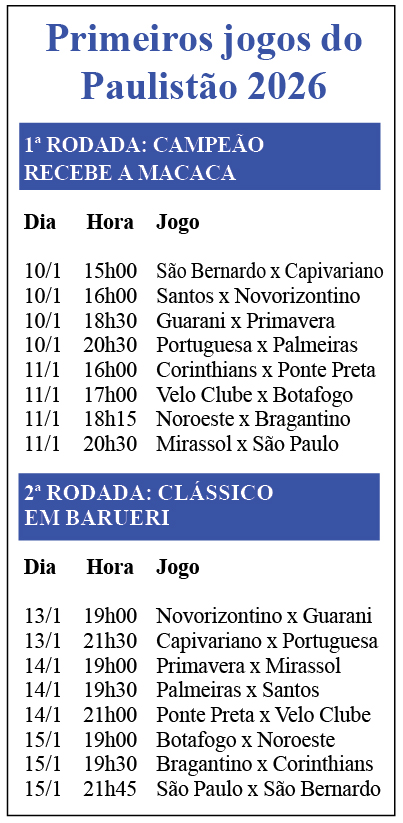 Atual campeão, o Corinthians compõe o pote A, ao lado do Palmeiras (vice de 2025), São Paulo e Santos. De acordo com o regulamento, o “quarteto de ferro” deverá duelar com dois oponentes do B (São Bernardo, Novorizontino, Bragantino e Mirassol), uma dupla do C (Guarani, Ponte Preta, Velo Clube e Portuguesa) e, por fim, um esquadrão do D: Capivariano, Primavera (egressos da A2 de 2025), Noroeste e Botafogo.