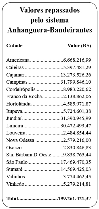 No total de repasses, entre o sistema Anhanguera-Bandeirantes e o RodoAnel Oeste, o montante chegou a pouco mais de R$ 223,9 milhões e beneficiou os cofres de 23 cidades.