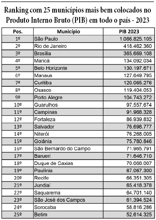 A lista segue de acordo com números anteriores, com o Rio de Janeiro na 2ª colocação nacional e Brasília (DF) na 3ª posição (ver quadro com 25 melhores posicionados no PIB do Brasil). A novidade nesse ranking é a subida do município de Maricá, no Rio de Janeiro, que saltou da 8ª posição no PIB de 2021 para a 4ª colocação em 2023, com um PIB de R$ 134 bilhões. Tal posição se deve ao crescimento, no município, de sua principal atividade econômica, ligada à extração de petróleo e gás natural e ao recebimento de royalties advindos dessas atividades.