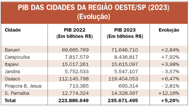Na soma, os sete municípios da região Oeste apresentam um PIB 2023 de R$ 235,6 bilhões, com crescimento de 5,26% em relação aos R# 223,8 bilhões de 2022.