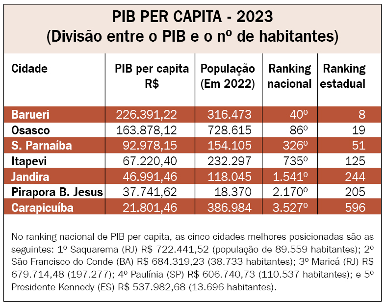 Um exemplo dessa “fraqueza” do PIB carapicuibano se traduz quando o IBGE revela o que chama de PIB Per Capita, ou seja, a relação dos números da riqueza com a quantidade de habitantes em cada cidade. Essa apresentação é feita de forma simples: pega-se o valor do PIB e divide-se pelo número de habitantes, para se obter o total do PIB Per Capita (por cabeça).