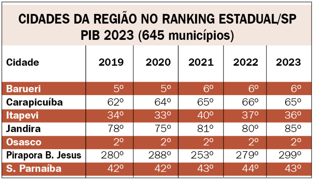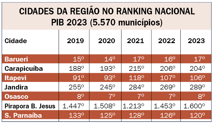 Outra cidade da região que se mantém nos primeiros postos desses rankings é Barueri que, com um PIB de 2023 em R$ 71,6 bilhões se mantém na 6ª colocação em nível estadual; mas que no nacional também perdeu um posto, caindo de 16º para 17º. Nesse caso, a relação de cidades que subiram e desceram envolvem nomes diversos. Por exemplo: de 2022 para 2023, Barueri superou Paulínia (SP) e Saquarema (RJ) que estavam à sua frente, mas perdeu posições para Salvador (BA), Goiânia (GO) e São Bernardo do Campo (SP), que vinham atrás da cidade da região no último levantamento. O crescimento dos números de Barueri de um ano para o outro, no entanto, não foi dos melhores e ficou em 2,84%.
