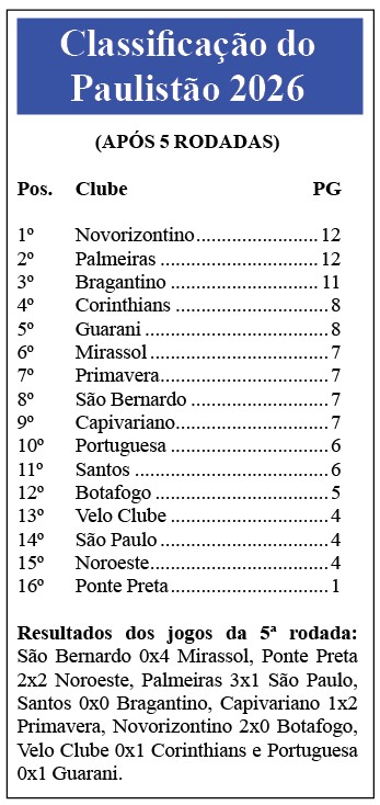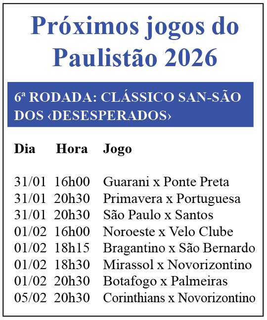 Palmeiras e Corinthians, os outros dois “grandes” da Capital, vêm em posições melhores na tabela: o Verdão, com 4 vitórias e 12 pontos, divide a liderança com o Novorizontino e na rodada anterior venceu justamente o clássico diante do São Paulo, por 3×1. Jogará neste domingo, 1º/2, fora de casa, diante do Botafogo (ver quadro com próximos jogos). O Timão, por sua vez, bateu o Velo Clube por 1×0 fora de casa na 5ª rodada, e agora vai encarar o Capivariano em jogo que acontecerá somente na próxima quinta-feira, dia 5 de fevereiro.