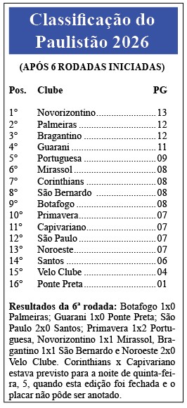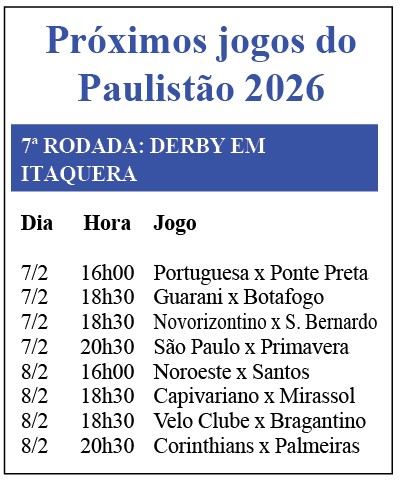 O Campeonato Paulista da Série A1 entrará neste final de semana em sua penúltima das oito rodadas previstas do módulo de classificação, etapa que definirá os “mata-matas” das semifinais e os dois clubes que cairão para a Série A2. O Novorizontino dá as cartas neste Paulistão 2026 e matematicamente já está com a vaga na mão. Entre os oito confrontos desta rodada, destaca-se na tabela divulgada pela Federação Paulista de Futebol (FPF) Corinthians x Palmeiras, previsto para a noite de domingo, 8 de fevereiro (ver quadros). O Verdão aparece à frente do arquirrival, em 2º lugar com 12 pontos, mas vem de derrota para o Botafogo, em Ribeirão Preto (1×0). Antes de protagonizar o Derby, o Timão ainda deveria esgrimir em Itaquera contra o Capivariano na noite de quinta-feira, 5, quando esta edição foi fechada e o placar não pôde ser registrado. Na ocasião, o escrete mosqueteiro figurava em 7º, com 8 pontos.
