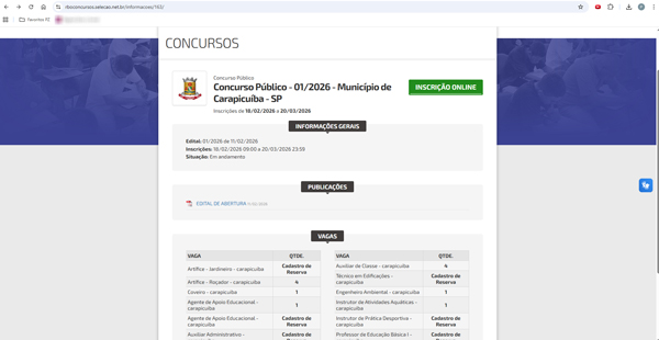 O edital completo pode ser acessado pelo site da Prefeitura de Carapicuíba, pelo link https://www.carapicuiba.sp.gov.br/contratacao/view/262/concurso-publico-edital-n-012026.