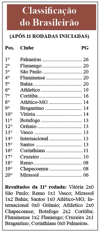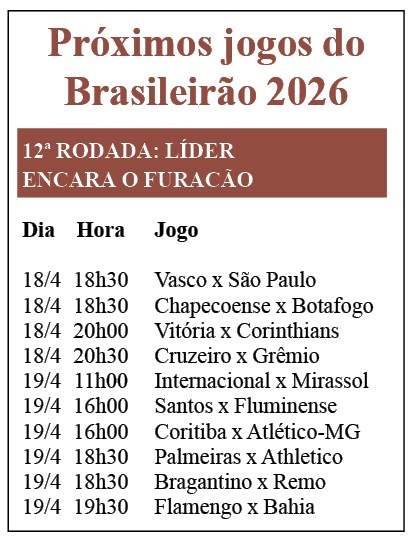 O Campeonato Brasileiro de futebol da Série A avançará neste final de semana e, mais uma vez, o Palmeiras iniciará a rodada, 12ª do turno de abertura, como líder isolado. O Verdão vem de empate em branco diante do Corinthians registrado no domingo, 12 de abril, Derby que terminou com dois alvinegros a menos e copiosos lamentos alviverdes. A razão das lamúrias é que a vitória deixaria ainda mais robusta sua “gordura” em relação ao 2º colocado deste Brasileirão 2026: o Flamengo (RJ), atual campeão e ainda com uma partida a menos (veja quadros).