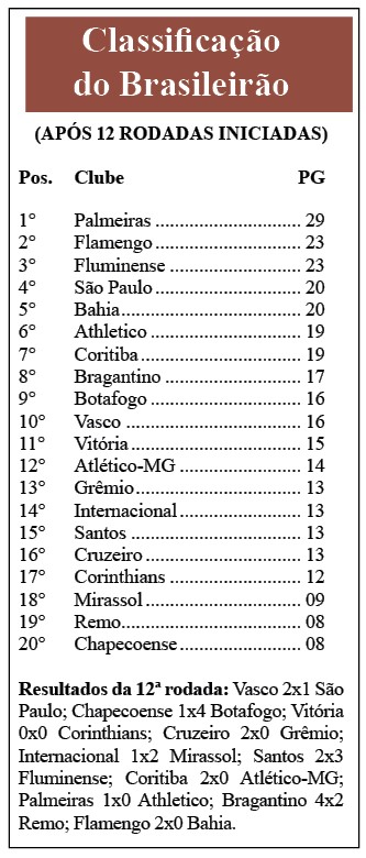 O torcedor alviverde não apenas conseguiu preservar a vantagem tranquila que tem na liderança da temporada, como ainda comemorou o ingresso do arquirrival Corinthians na zona de rebaixamento após o encerramento da 12ª rodada do Campeonato Brasileiro de futebol da Série A, o Brasileirão 2026. O Verdão recebeu o Athletico (PR) e ganhou pela contagem mínima no domingo, 19 de abril, placar suficiente para seguir à frente do Flamengo (RJ) na tábua de classificação, com 29 pontos. O rubro-negro e o Fluminense (RJ) somam o mesmo número de pontos (23), mas o clube da Gávea leva vantagem nos critérios de desempate, além de ter um jogo a menos que seus adversários. Em Salvador (BA), Vitória e Corinthians não destravaram o escore. O zero a zero derrubou os mosqueteiros para 17º e agora o Timão abre a zona de degola há nove partidas sem vencer (ver quadros).