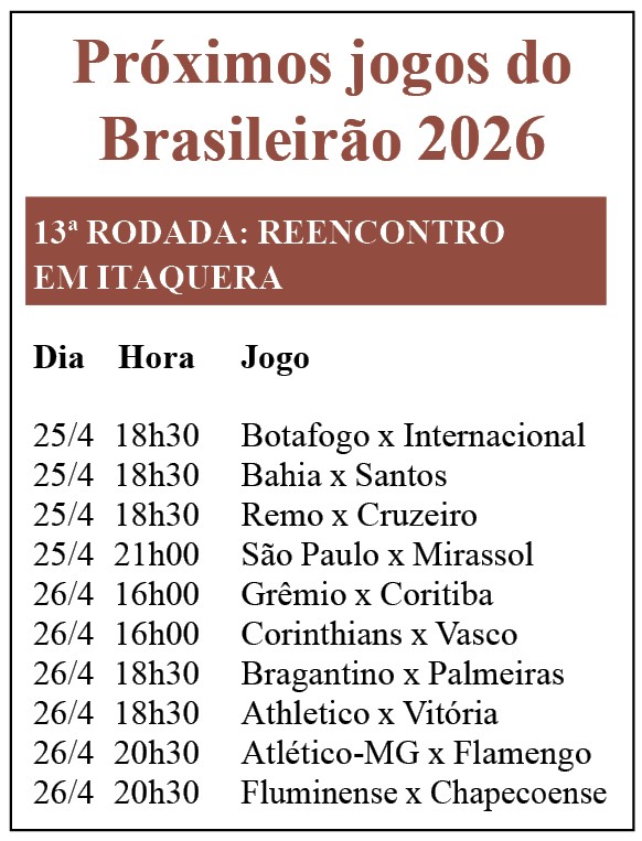 Corinthians x Vasco, marcado para começar às 16 horas deste domingo, 26 de abril, é um dos destaques da 13ª rodada da competição nacional. O clássico marcará o reencontro do técnico Fernando Diniz, agora no Parque São Jorge, contra seu mais recente empregador e clube que defendia quando ambos decidiram ao final do ano passado a Copa do Brasil, vencida pelos corintianos, ainda comandados por Dorival Júnior. Com gordura para queimar e ainda assim não se levantar do trono, o Palmeiras visitará o Bragantino um pouco mais tarde. Na véspera, sábado, 25/4, Bahia x Santos medirão forças a partir das 18h30 e às 21 horas deverá começar São Paulo x Mirassol, em jogo que o Tricolor deverá levar para o estádio Brinco de Ouro, em Campinas.